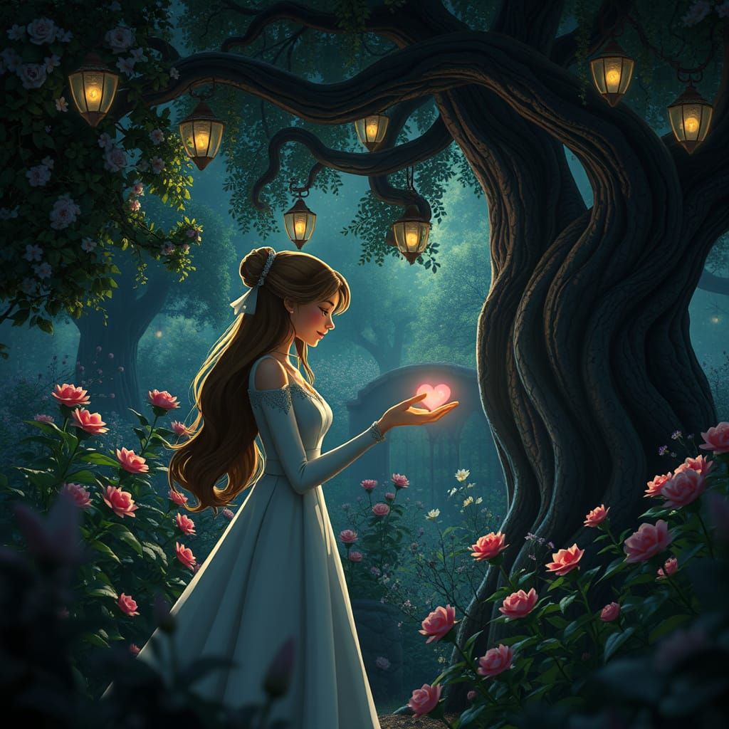 A cinematic image of a woman in love, making a promise in a magical garden filled with luminous flowers and ancient trees. The scene is depicted with dark shadows and warm lighting, in the style of Pan's Labyrinth.