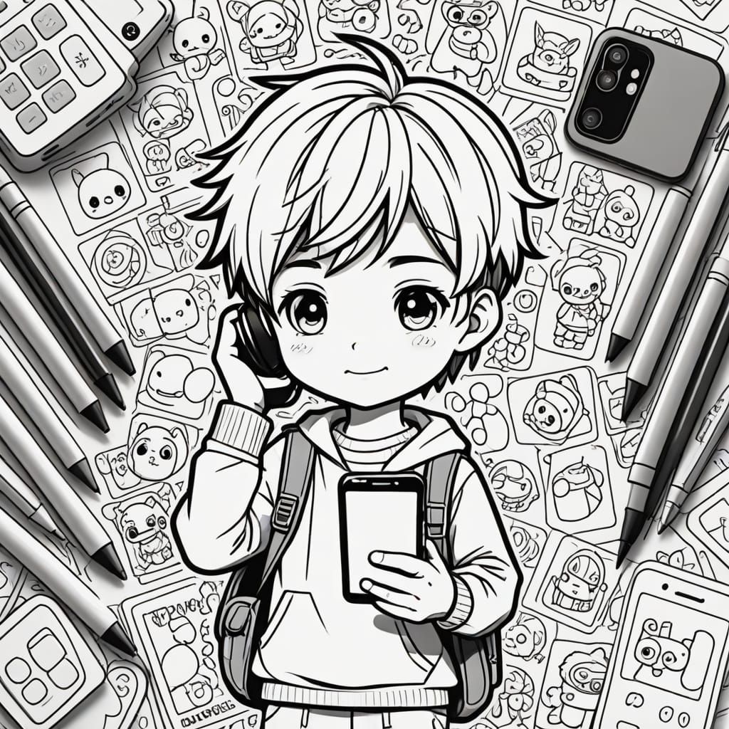 This charming illustration features a cute, chibi-style character, a two-year-old boy, holding a phone, presented as a coloring page with cartoon doodles.