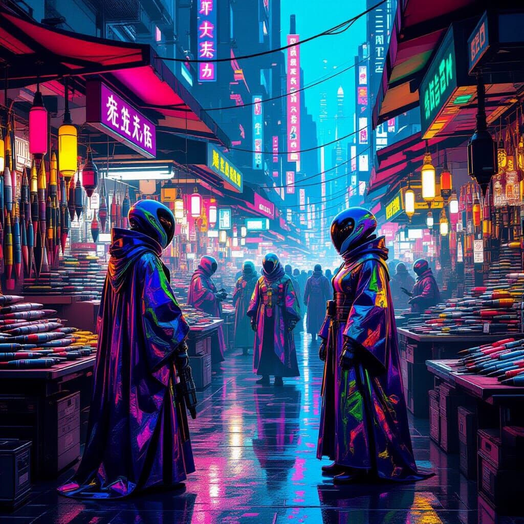 This image shows an alien market with vendors in iridescent robes selling missiles and hand grenades. The scene features wild colors and a cyberpunk aesthetic. The overall effect is futuristic.