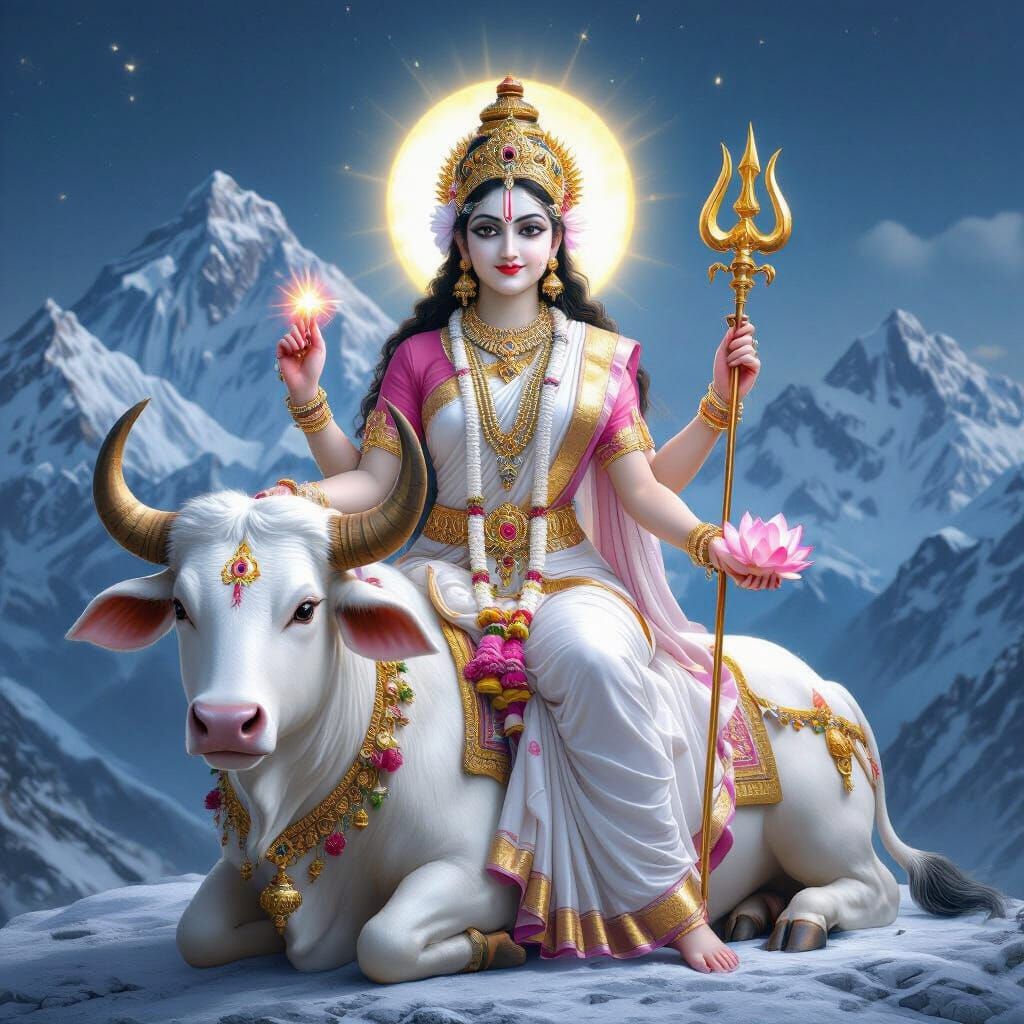 This image shows Maa Shailputri, the first Navadurga, seated on her bull Nandi against a backdrop of snowy Himalayan mountains. She holds a trident and lotus, radiating a divine glow.