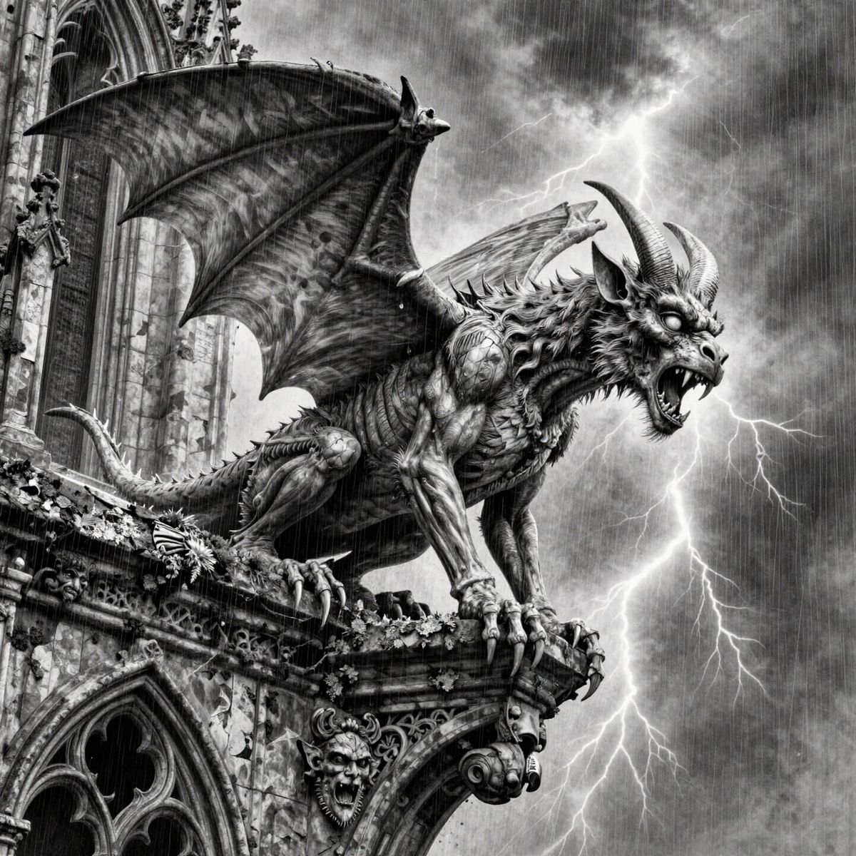 A detailed graphite pencil drawing of a menacing gargoyle perched on a Gothic cathedral ledge during a lightning storm. The demon combines bat wings, leonine body, and reptilian scales.