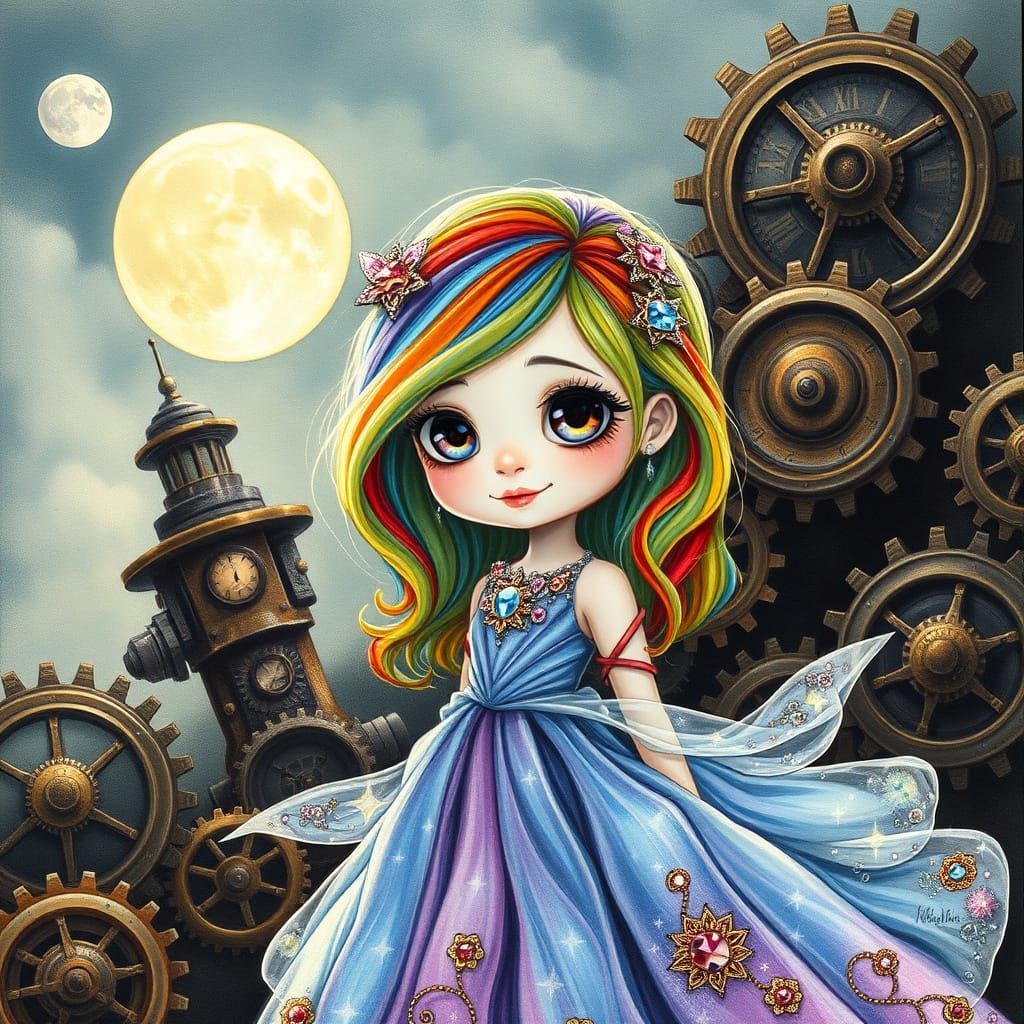A young girl with rainbow hair and gemstone eyes stands in a clockwork garden. This digital artwork evokes a glossy colored pencil drawing with whimsical, surreal fantasy elements.