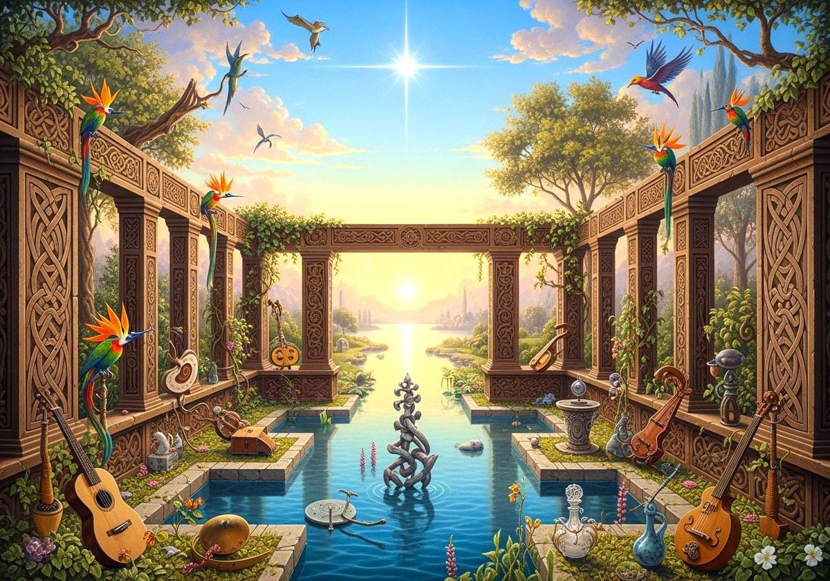 This image showcases a tranquil, harmonious natural landscape featuring gentle Celtic art in its design. It's rendered in rich pastel colors with surreal hyperrealism, evoking peace and otherworldly beauty.
