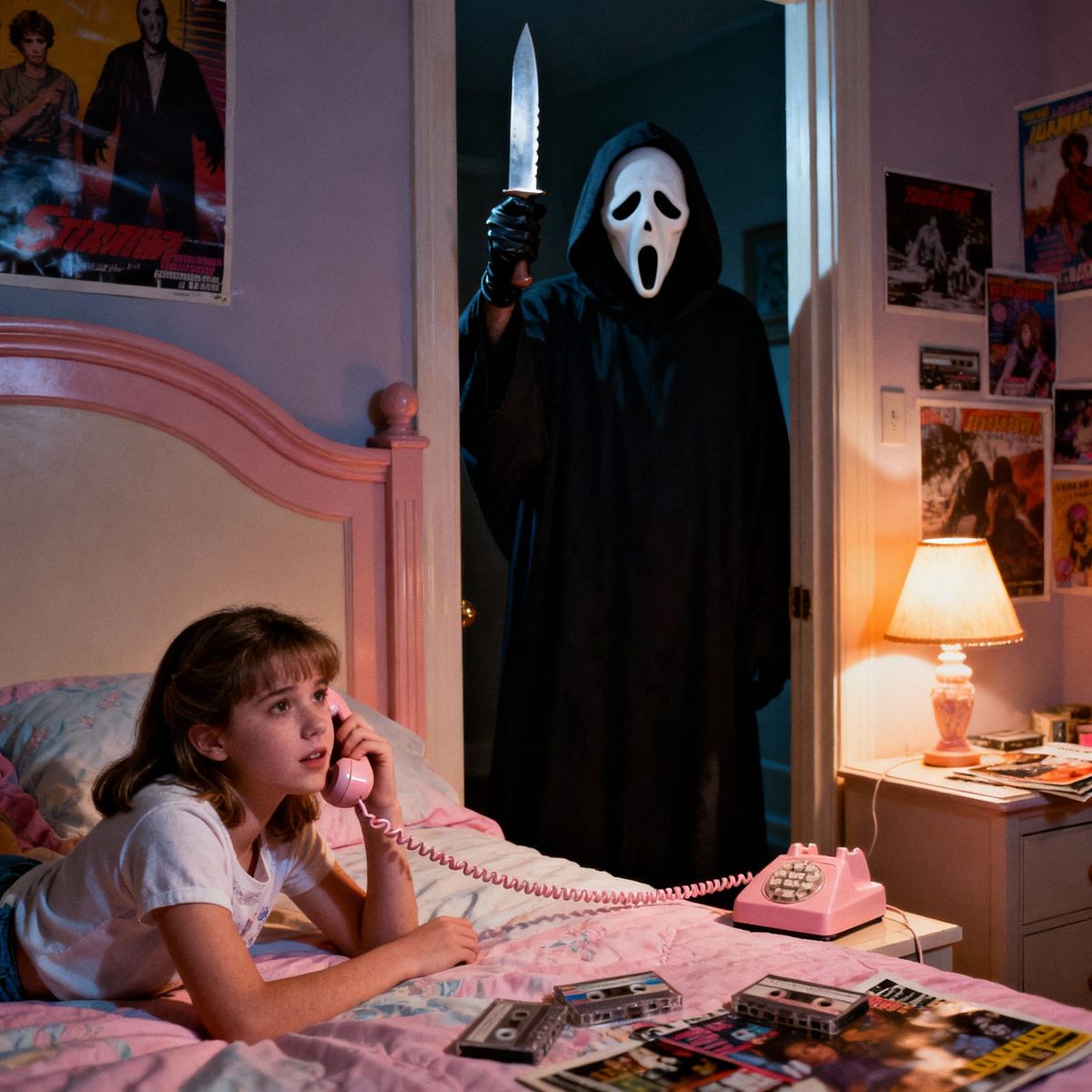 A photo-realistic scene in the style of an 80s slasher film. A girl chats on a corded phone on her bed while an ominous figure with a knife lurks in the doorway, bathed in dramatic lighting.