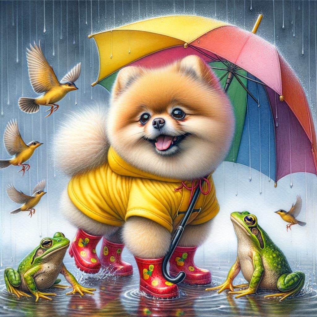 This image shows a fluffy Pomeranian wearing a yellow raincoat and red boots, joyfully dancing with frogs in a puddle under a vibrant umbrella. It is a watercolor-style image with vivid colors.