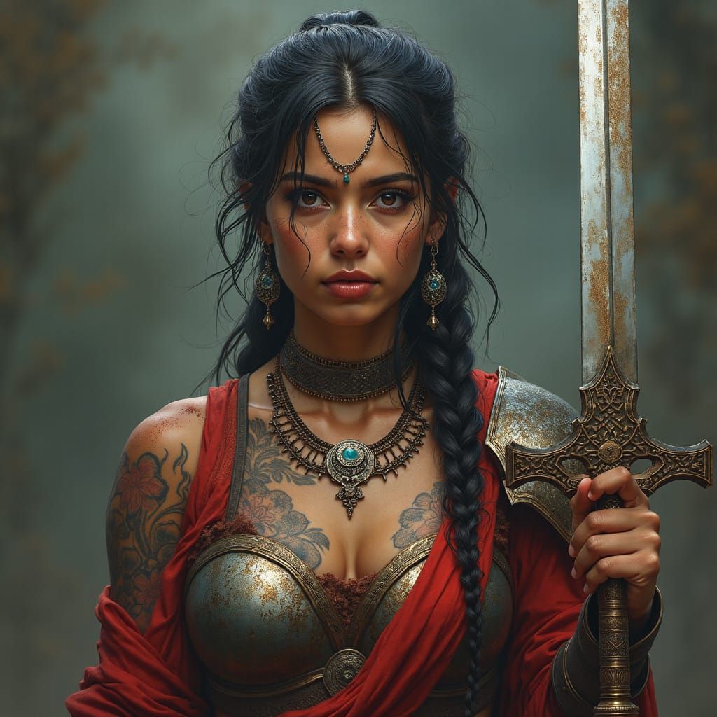 A strong Bangladeshi woman wields a sword, her tattoos and armor evident as she exudes determination and strength in a fierce battle scene.