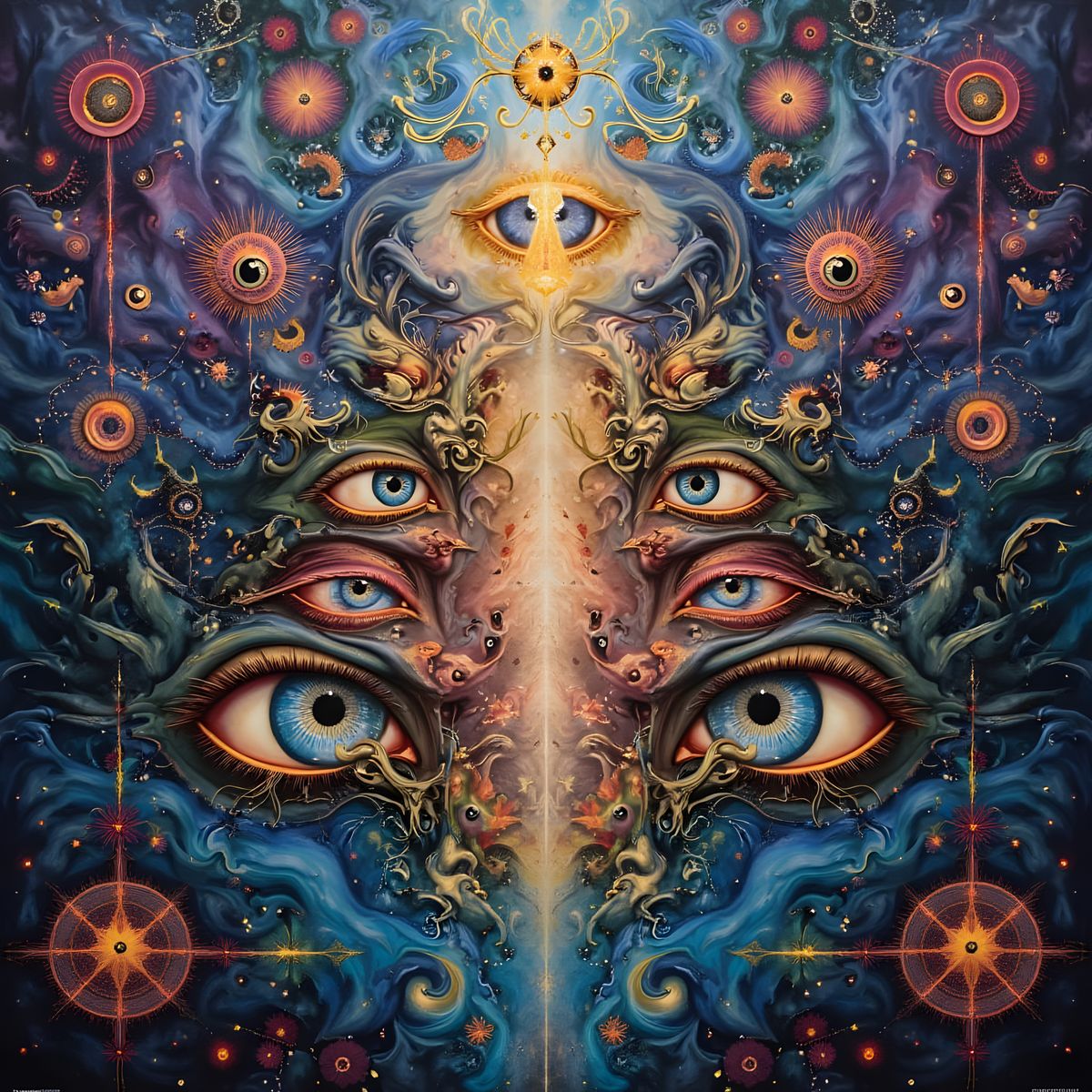 This image is a mesmerizing blend of mysticism and spiritualism, featuring a kaleidoscope of eyes in a dreamlike, visionary style, surrounded by intricate patterns and mandalas reminiscent of sacred geometry and psychedelic art.