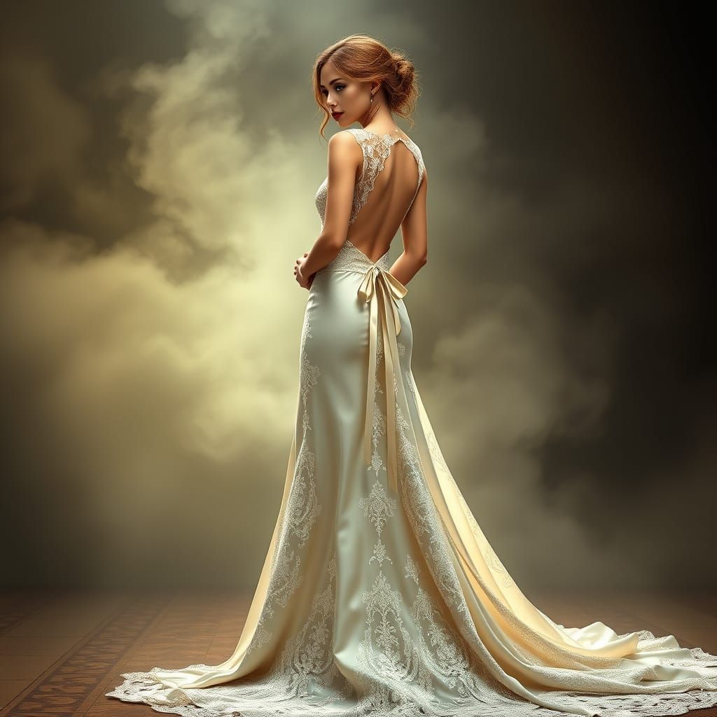 This image showcases a stunning woman in a breathtaking cream and lime silk wedding gown with an open back, featuring a floor-sweeping lace train, intricate sequins, and a dainty lace ribbon. The detailed, matte-painted aesthetic has a subtle splash-screen effect, evoking an ethereal atmosphere reminisce...