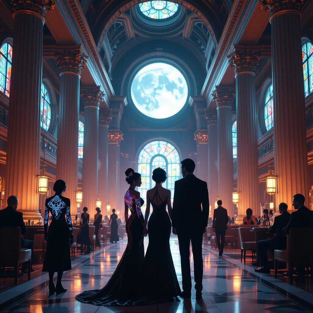 A majestic bar interior illuminated by moonlight filtering through stained-glass windows. The scene depicts a clandestine nighttime meeting with diverse characters in a futuristic, cinematic style.