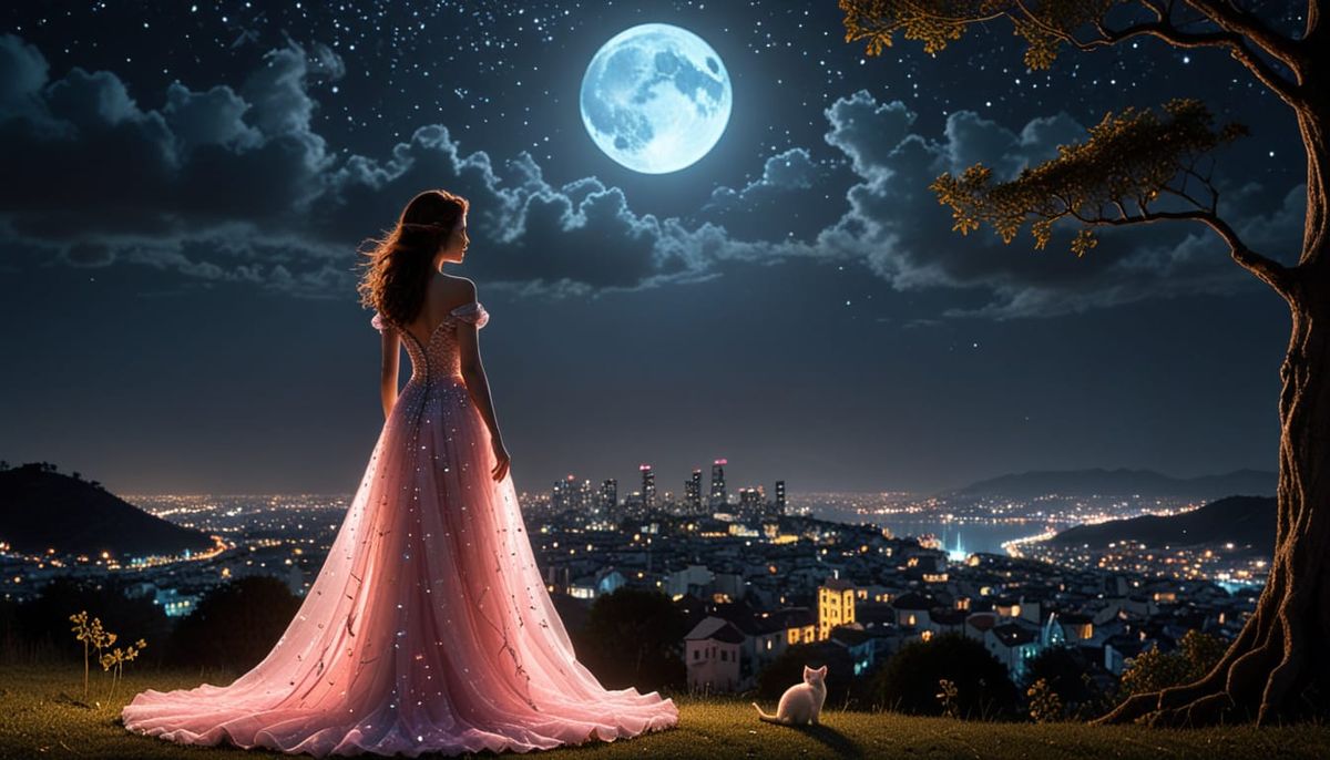 A 3D image of a beautiful cat woman in a sleek black dress, posed dynamically on a rooftop. A large opal moon casts an iridescent glow, with a soft, layered halo of pink. The image is in a surreal neon art style.