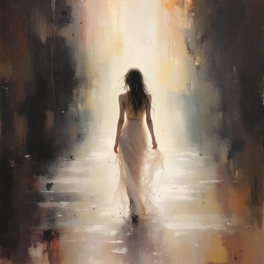 A portrait of a woman walking down a quiet street in soft directional lighting. The art employs loose gestural brushwork and atmospheric charcoal techniques to create depth and introspection.