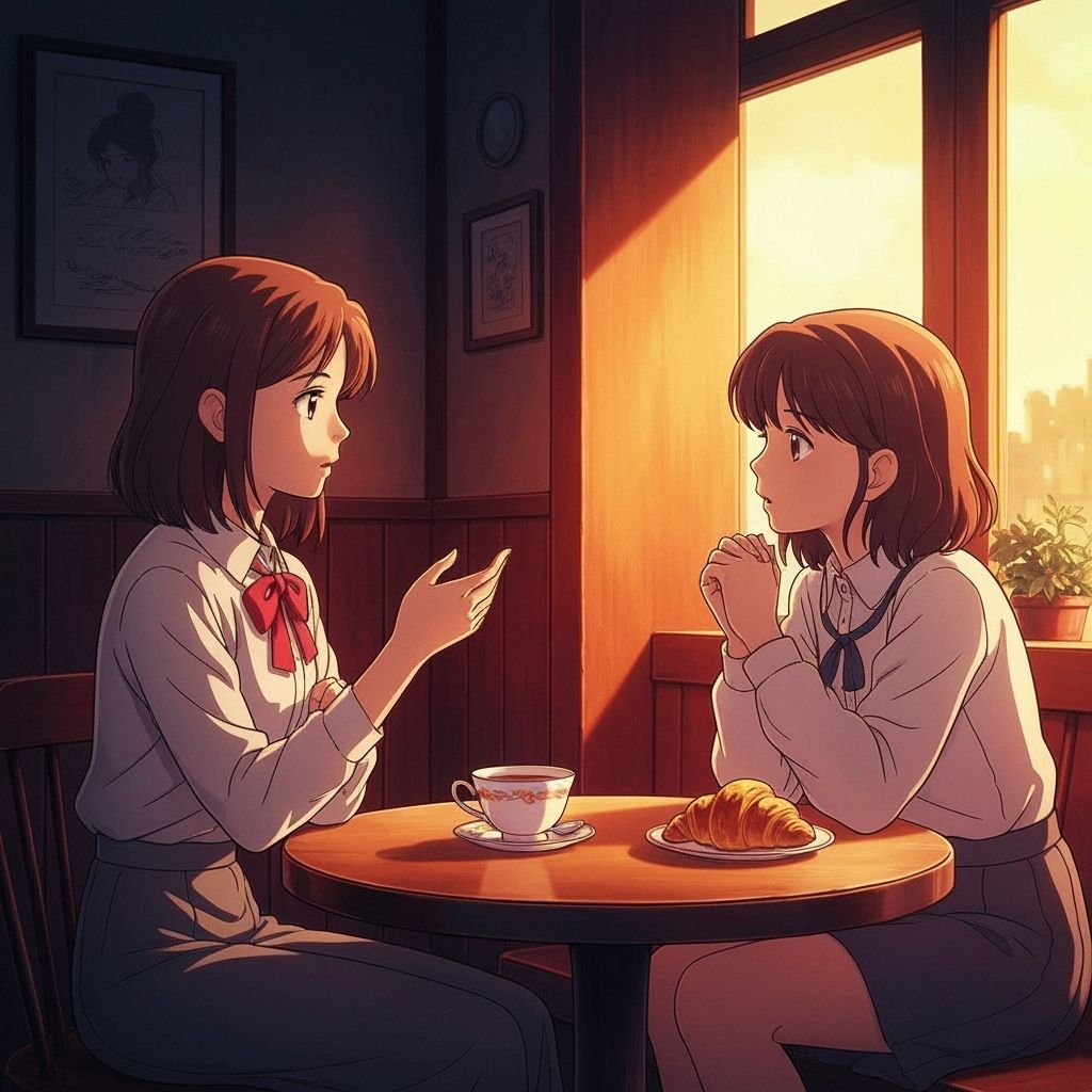 This image shows two women talking in a coffee shop, inspired by Studio Ghibli. Features warm lighting, deep colors, and a cel-shaded anime aesthetic.
