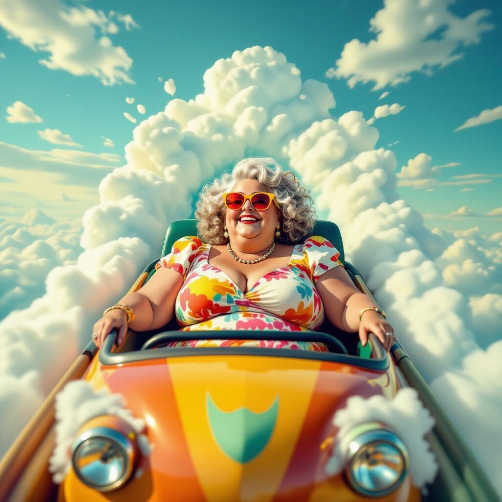 A striking picture of an older woman with a bright smile enjoying a surreal roller coaster ride. This vibrant image blends realism with dreamlike scenery in a surrealist aesthetic.