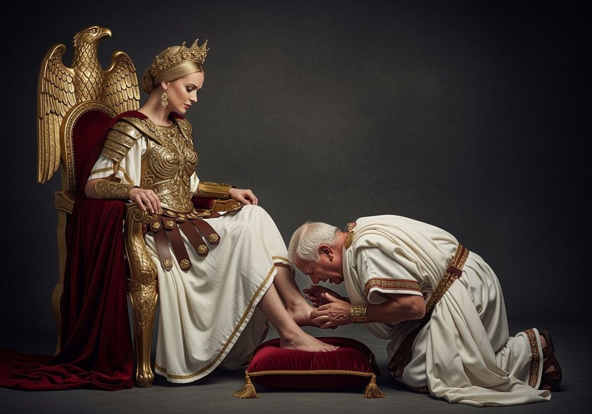 This image shows a Roman Empress in golden armor sitting barefoot on her throne. An old senator kneels before her, kissing her feet as she gazes at him with an angry expression. The image is captured in professional photography style.