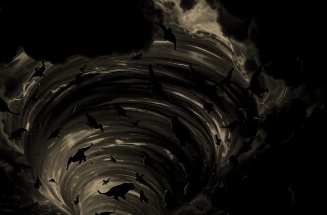 This surreal digital art shows a golden tornado filled with flying zoo animals amidst a dramatic thunderstorm. Stark lightning illuminates the chaotic scene.