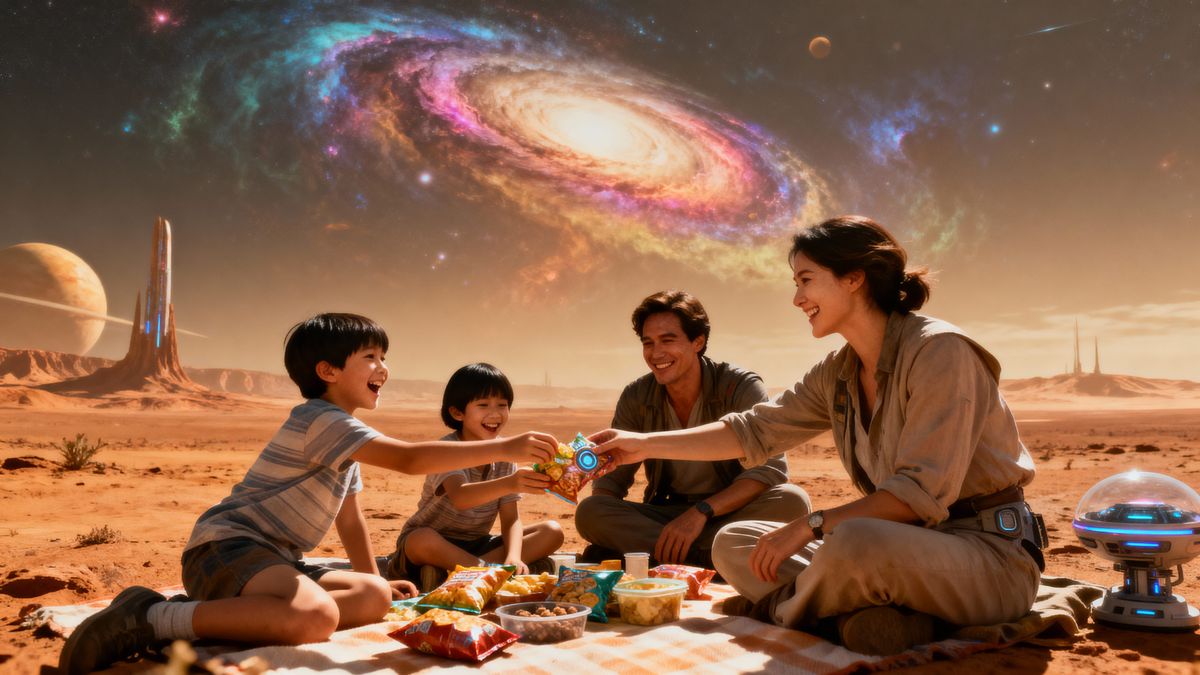 A nostalgic film still captures a family enjoying a picnic on terraformed Venus. Children reach for snacks under a nebula sky, bathed in warm light. Shot in vintage Polaroid style.