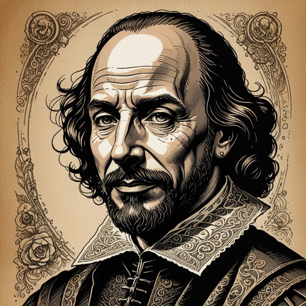 A striking ink drawing of William Shakespeare in a comic book art style. The portrait features thick lines, cross-hatching and rich, expressive shading in an earthy color palette.