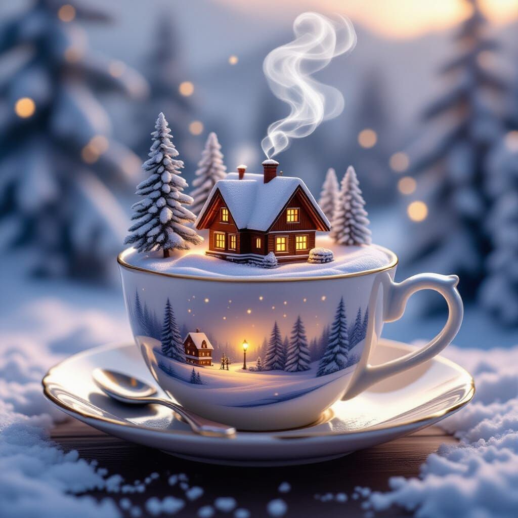 This image shows a miniature alpine village nestled inside a teacup, complete with snow-covered trees and steaming vapor. Warm lighting and soft pastel colors create a cozy, magical realism aesthetic.
