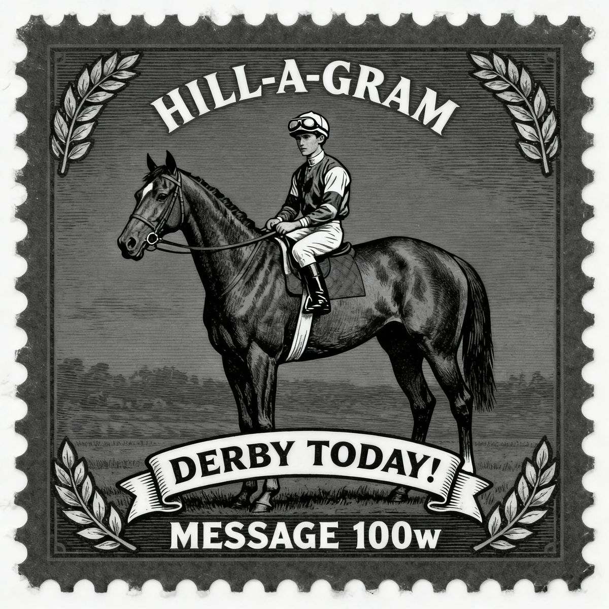 This image showcases a vintage-style postage stamp in a detailed engraved style, featuring a thoroughbred racehorse with a jockey. The stamp has a dark charcoal grey palette and reads 'DERBY TODAY!'.