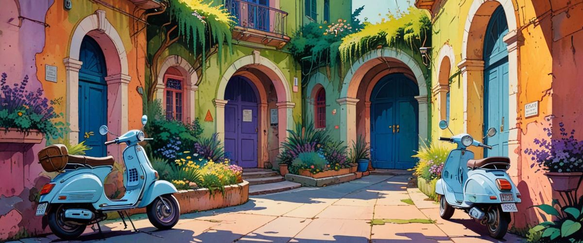 A vibrant watercolor and gouache image of an abandoned boulevard. The scene features a white Vespa, mossy benches, stone arches, and colorful political posters in bright, clear sunlight, rendered in a comic book style.