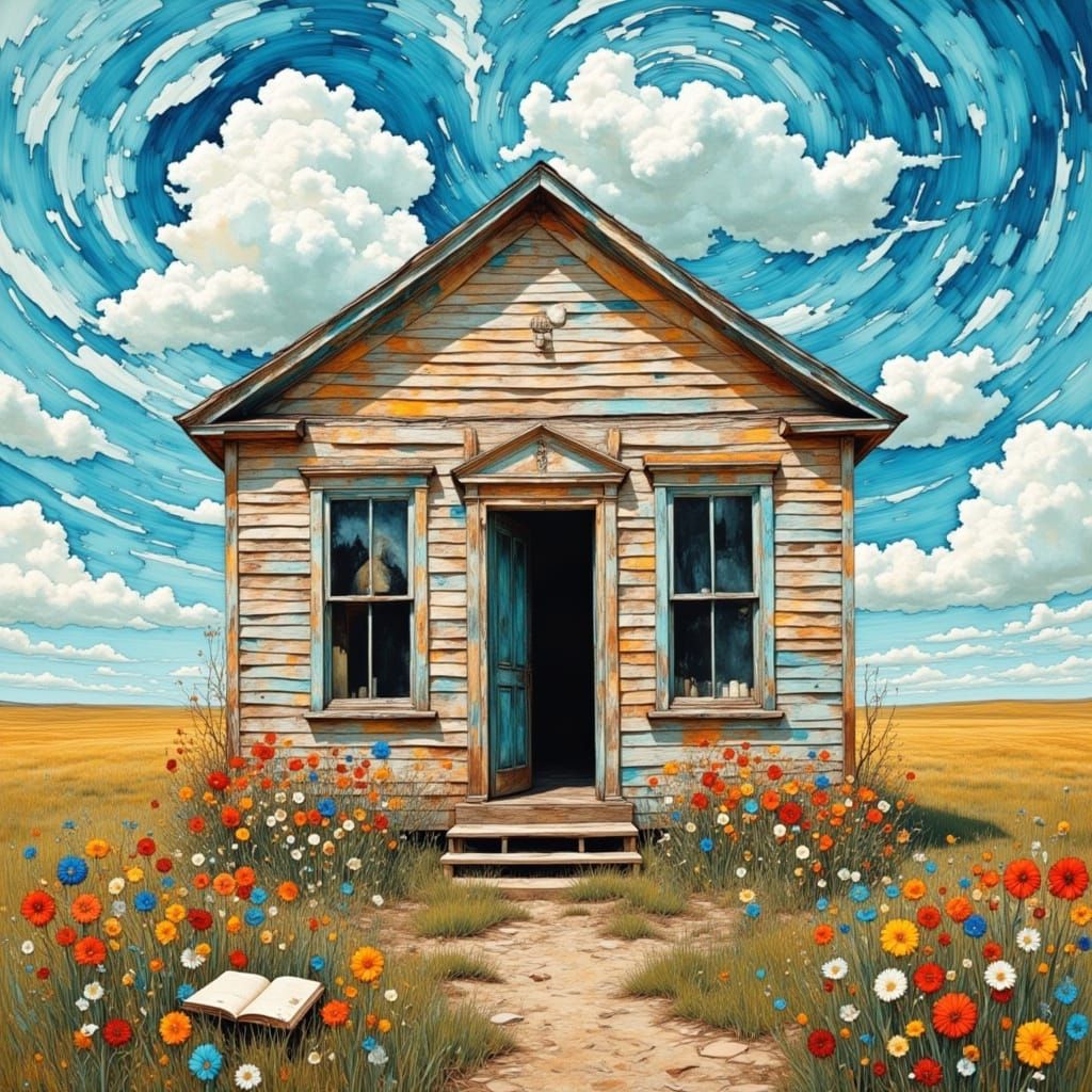 A nostalgic image of a weathered one-room schoolhouse in rural Kansas, circa 1940s. The vibrant wildflowers and Van Gogh-style sky evoke a sense of romantic impressionism.
