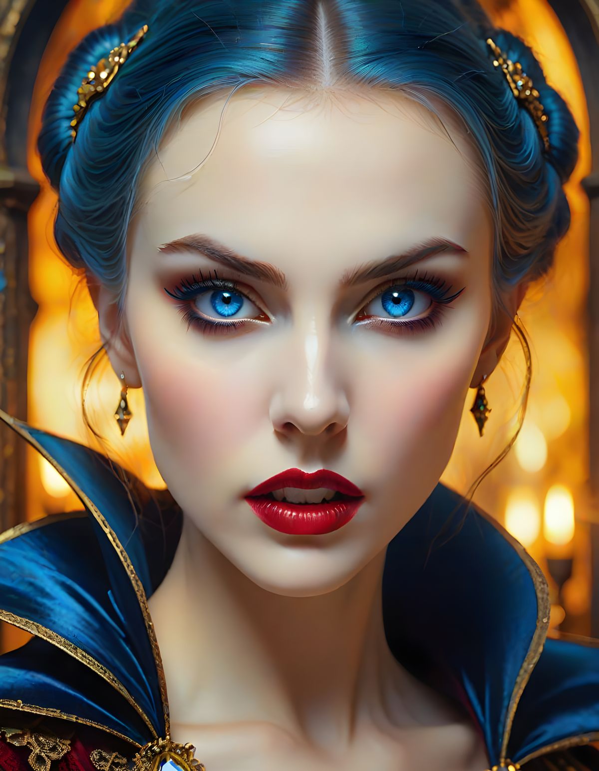 A striking picture of a beautiful vampire expressing awe. The portrait features intricate details, bright colors, and a surreal aesthetic, set against an antique ruin backdrop.