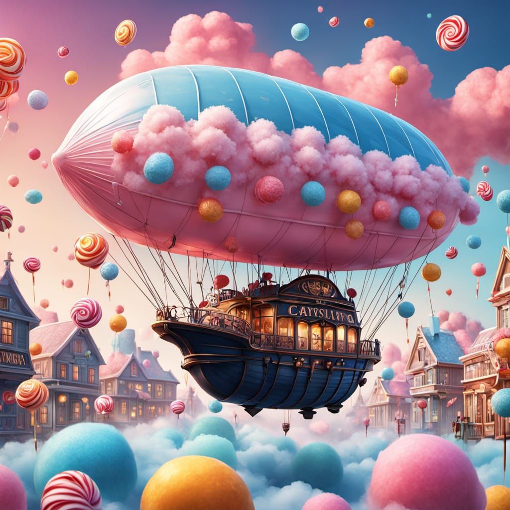This image shows a whimsical 1950s-style cotton candy shop airship floating in the sky. The candy art style features vibrant colors, sparkling sugar crystals, and golden hour lighting in a hyperrealistic digital illustration.