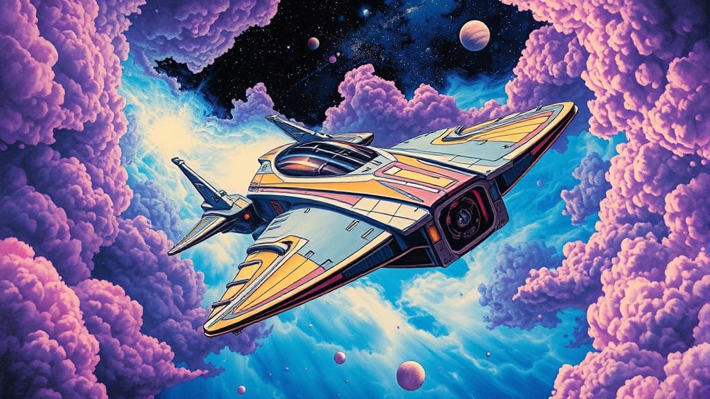 A vibrant, high-speed depiction of a spaceship soaring through a swirling nebula, with stars and planets in the distance, featuring intricate details and bold, metallic colors reminiscent of classic sci-fi album art.