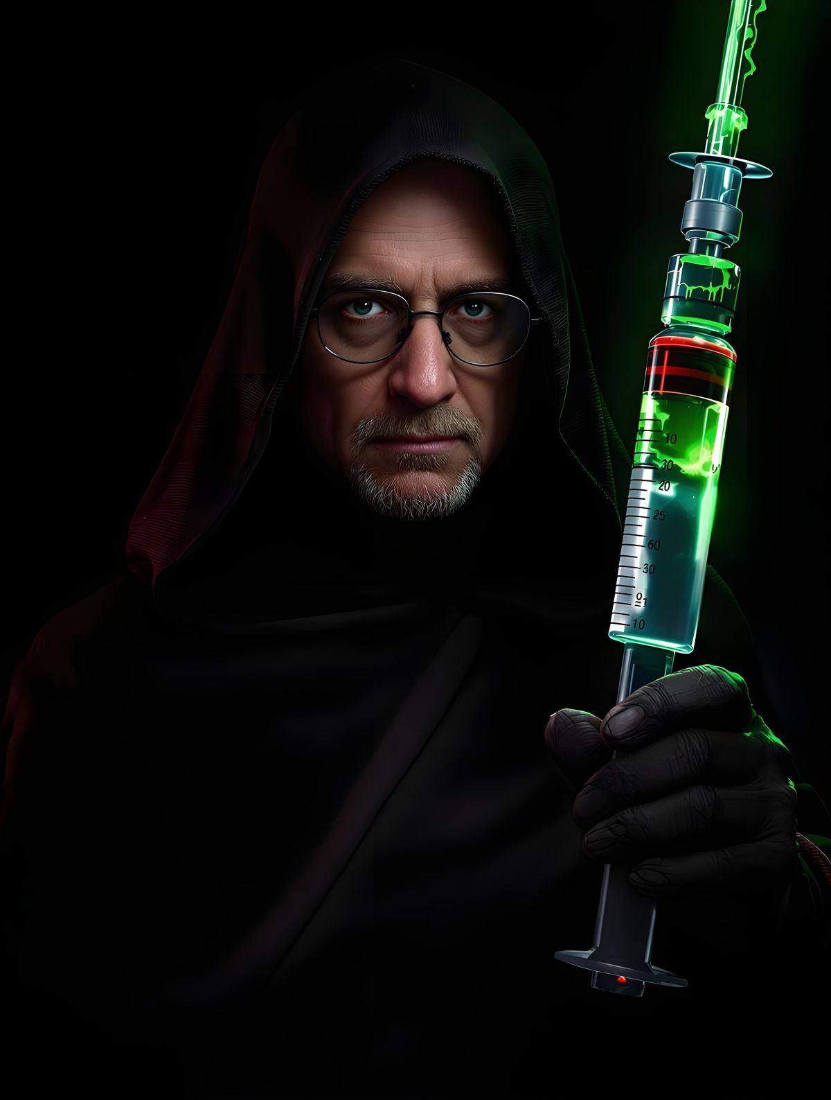A Sith master stands in a mysterious, shadowy background, wearing reading glasses and holding a medical syringe filled with neon green fluid. The character's expression is pensive and defensive, adding to the air of intrigue.