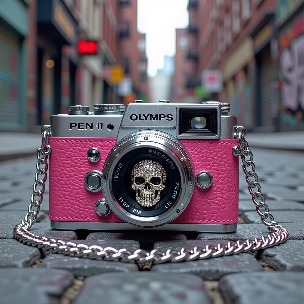 This image showcases an Olympus PEN E-P1 camera in a comic art style, featuring pink leather, a rhinestone skull, and a silver chain strap. It rests on cobblestones, rendered with vibrant colors and dynamic linework for a pop art aesthetic.