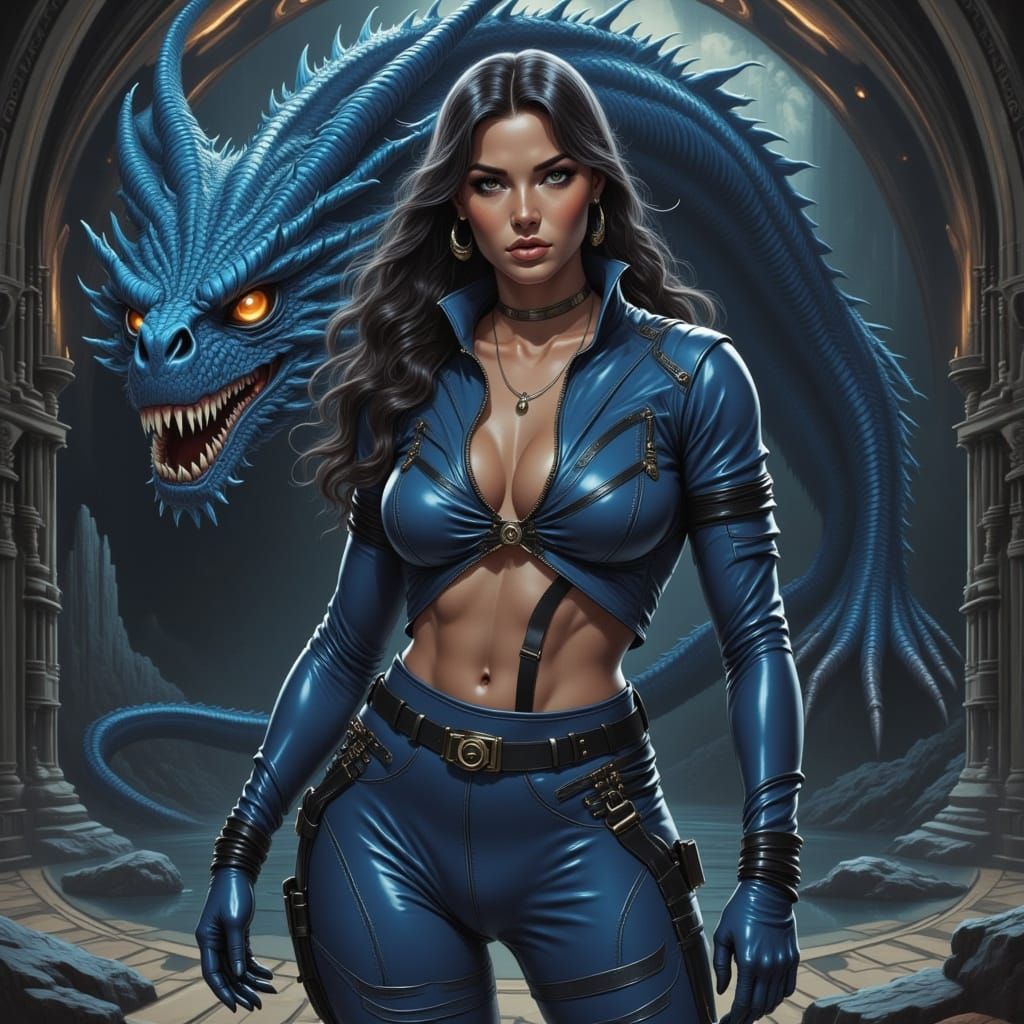 A striking picture of a muscular woman in blue leather standing before a large blue dragon. The image is rendered in dark academia comic book art with retrofuturism elements, using high contrast lighting and a muted color palette with golden accents.