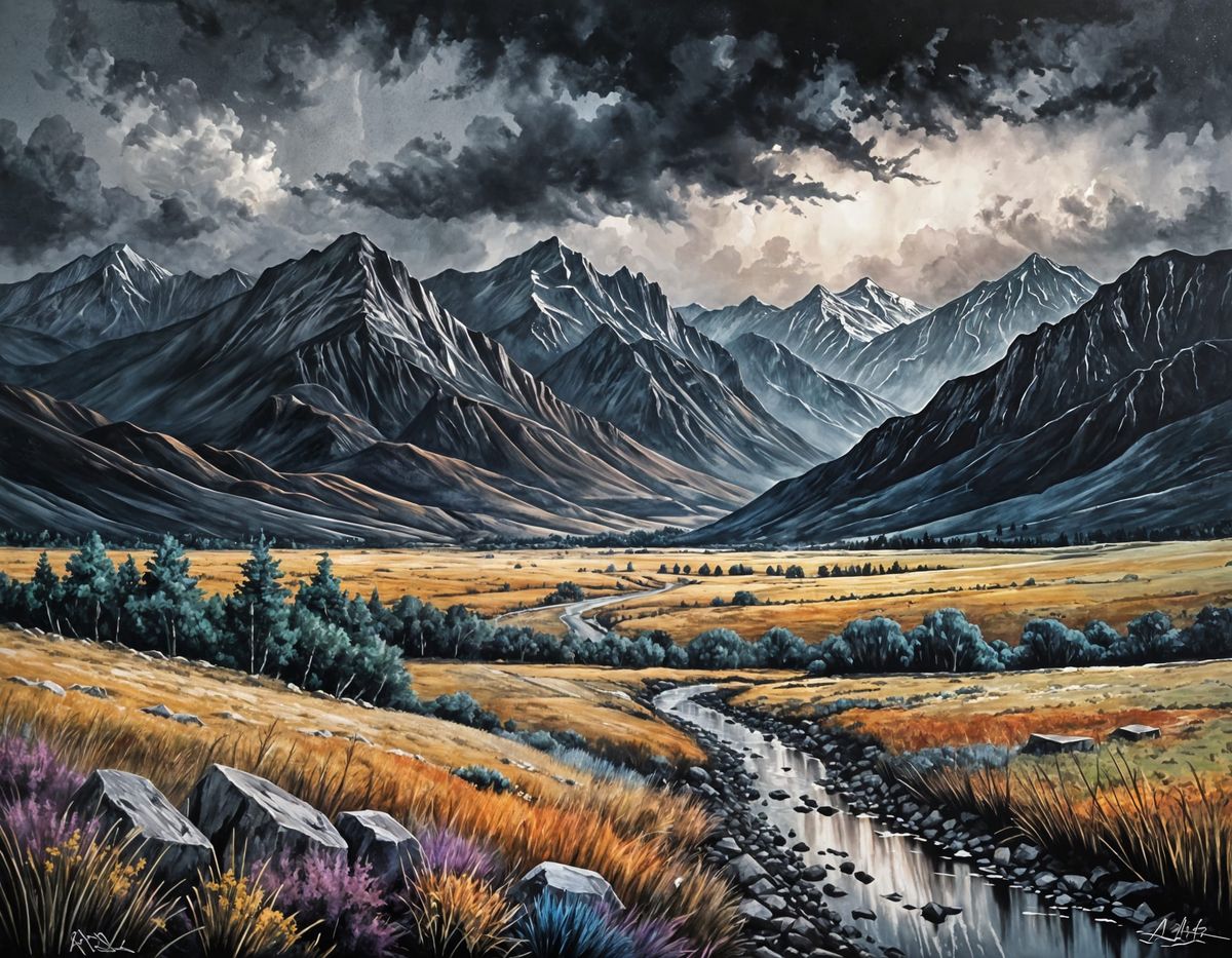 Easily generate your own mountain range images with our free AI oil painting tool, featuring vibrant pastel colors and moody skies