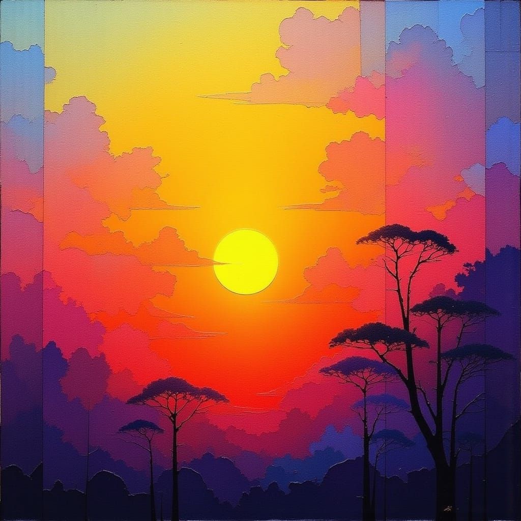 A vibrant and structured sun evokes the summer solstice. The image has a magical beauty with opalescent colors, in a style reminiscent of Klee and Rothko.