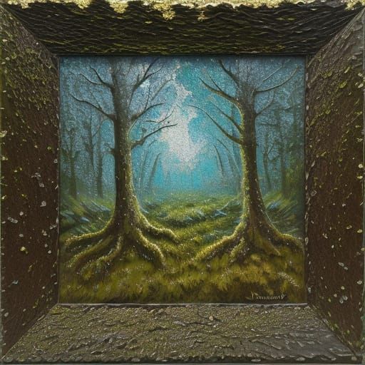 A close-up oil painting of a mossy cavernous landscape. Macro photography with thick impasto paint texture, vibrant polka dots and tessellating geometry. Warm golden lighting creates an expressive neo-impressionist aesthetic.