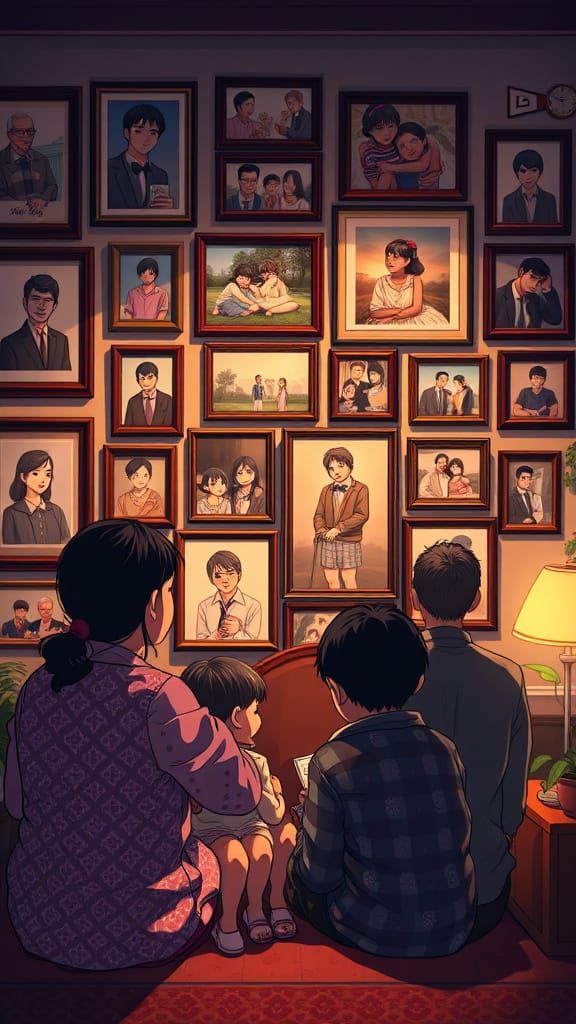 This image shows a warmly lit photo wall depicting a family's history. The vibrant, cel-shaded style evokes dynamic anime aesthetics, with rich colors and meticulous details, reminiscent of Studio Trigger.