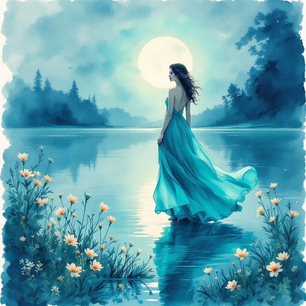 A watercolor painting of a graceful woman by a moonlit lake. The image employs a radial gradient dissolve effect with transparent washes, creating a romantic, impressionistic nocturne in turquoise and silver.