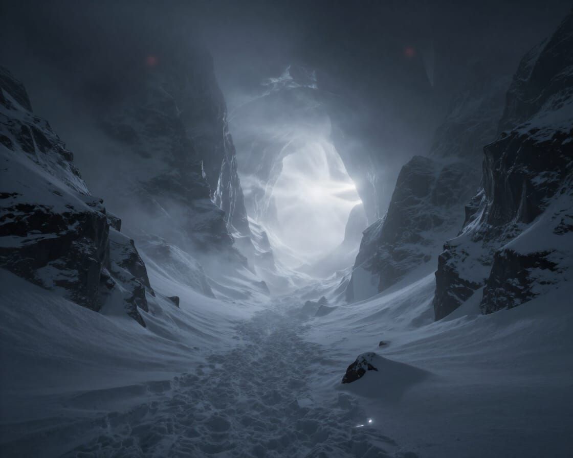 A hyperrealistic, wide-angle view of a treacherous snowy mountain range shrouded in ethereal mist. Dynamic light spills from a hidden cave, creating a mystical, cinematic atmosphere.