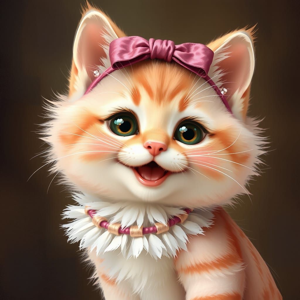 This image shows a playful, pink kitten girl in a whimsical, gothic-inspired setting, blending classic art styles with a modern twist.