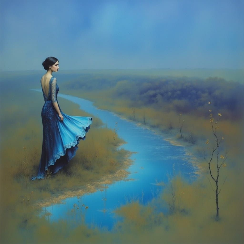 A woman in a flowing, diaphanous blue gown with intricate gold embroidery and delicate lace trim, set against a vibrant, gradated background of blues, purples, and golds, with dramatic chiaroscuro lighting and expressive brushstrokes