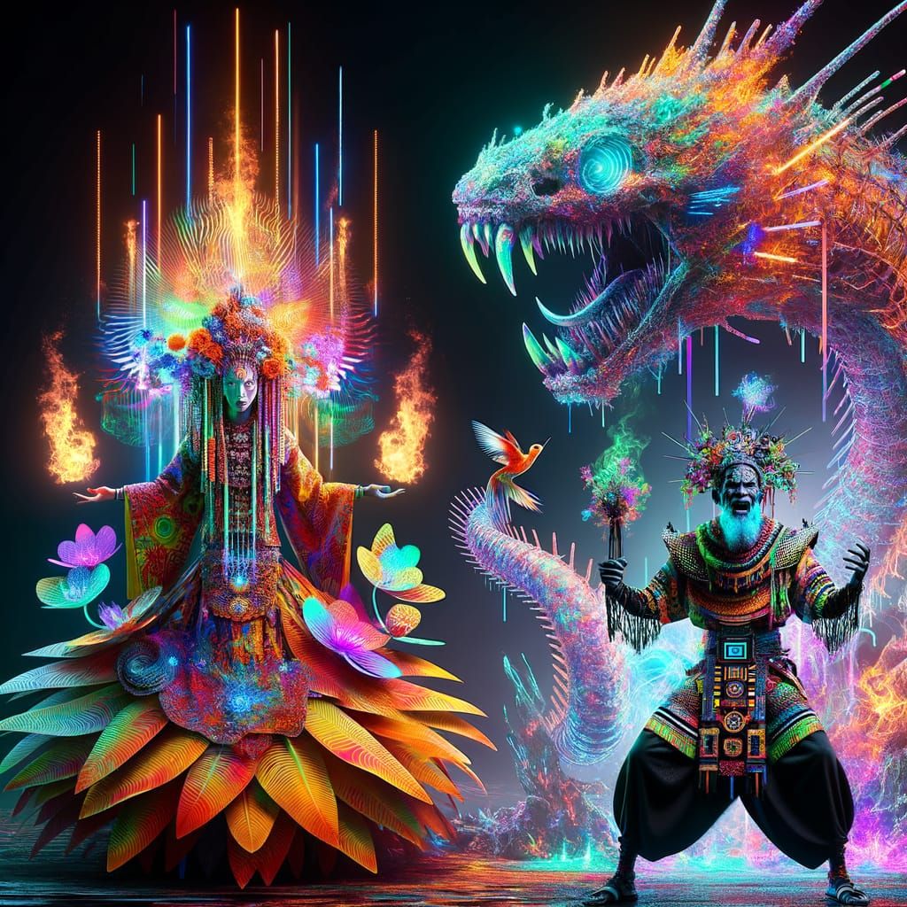 A surreal, hyper-detailed sci-fi scene featuring a goddess in a luminous banana leaf dress and neon orchids. A giant aquarium with a neon mermaid and a glitch-faced figure with neon dreadlocks complete the otherworldly, vibrant composition.
