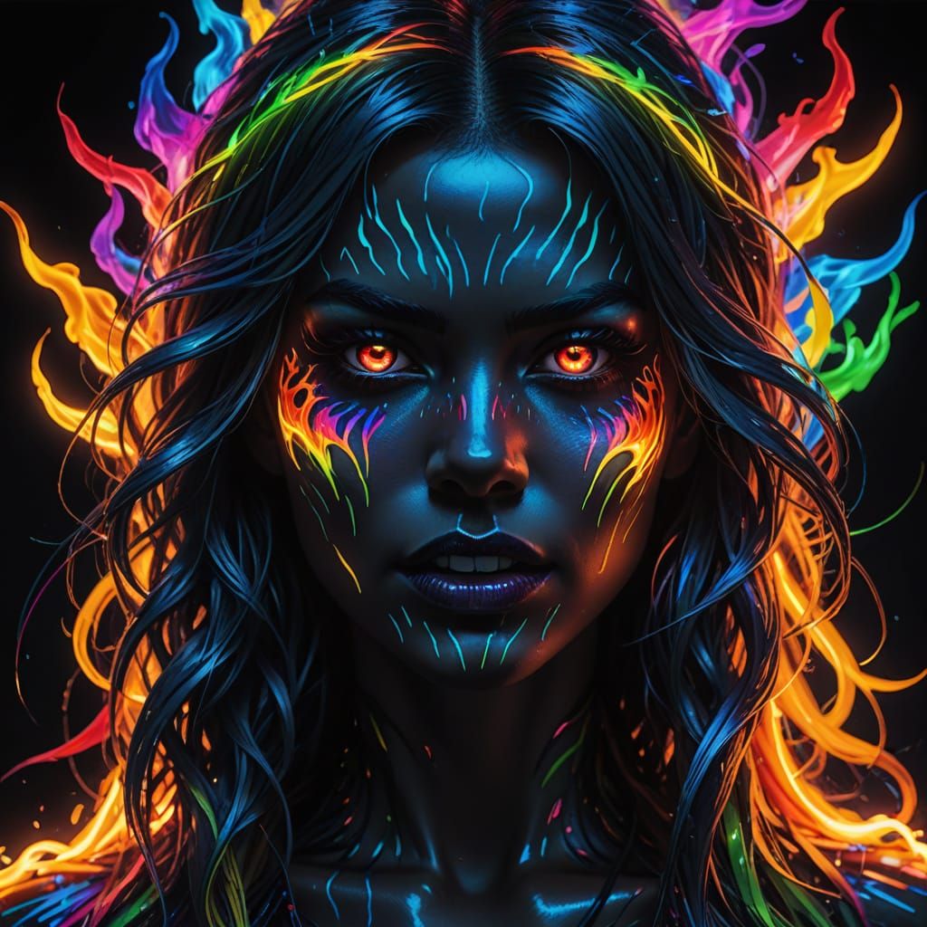 This image depicts a stunning, dark-skinned beauty with glowing rainbow flames in her eyes, hair, and lips. Electric neon rainbow-colored claws gleam with razor-sharp tips, leaving trails of flames behind.