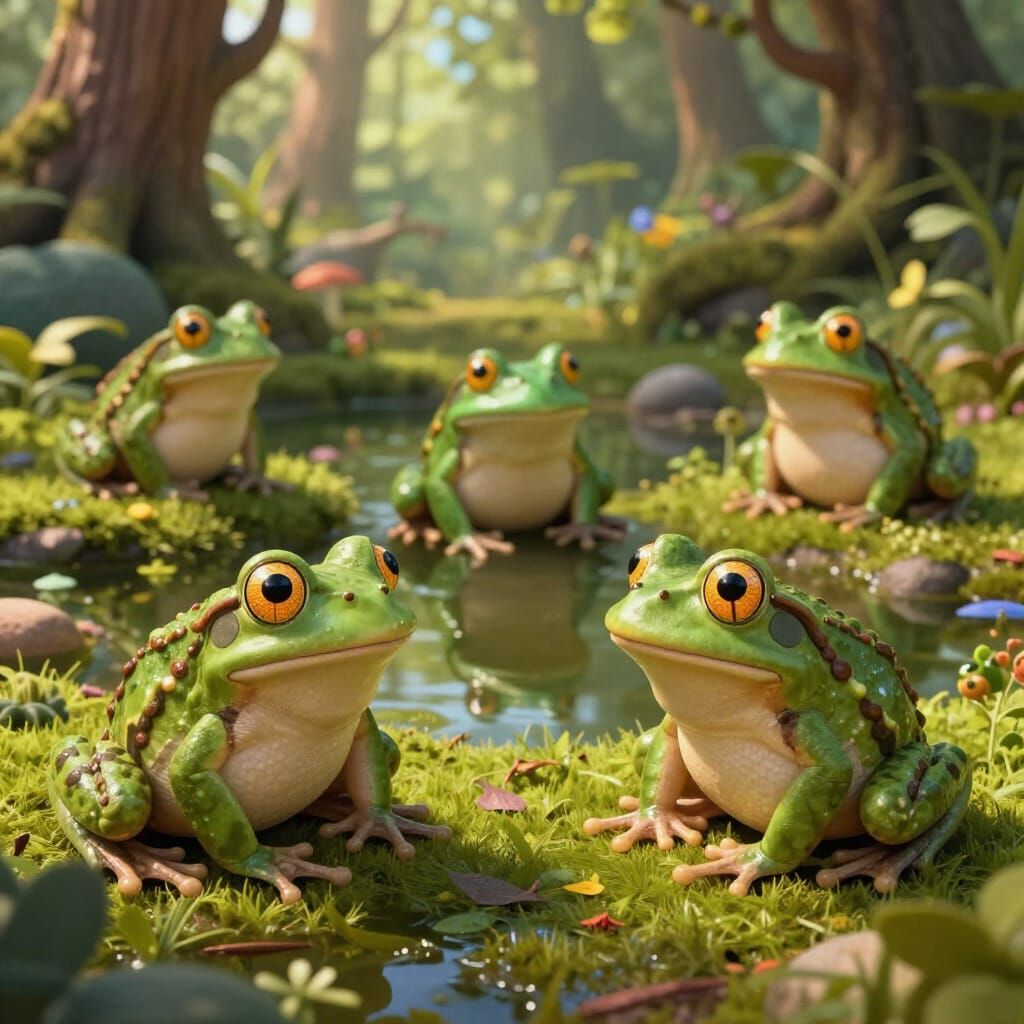 This image features cute, cartoon-style frogs with expressive personalities in a surreal, sun-dappled pond. Rendered with vibrant colors and intricate textures in a fantasy art style.