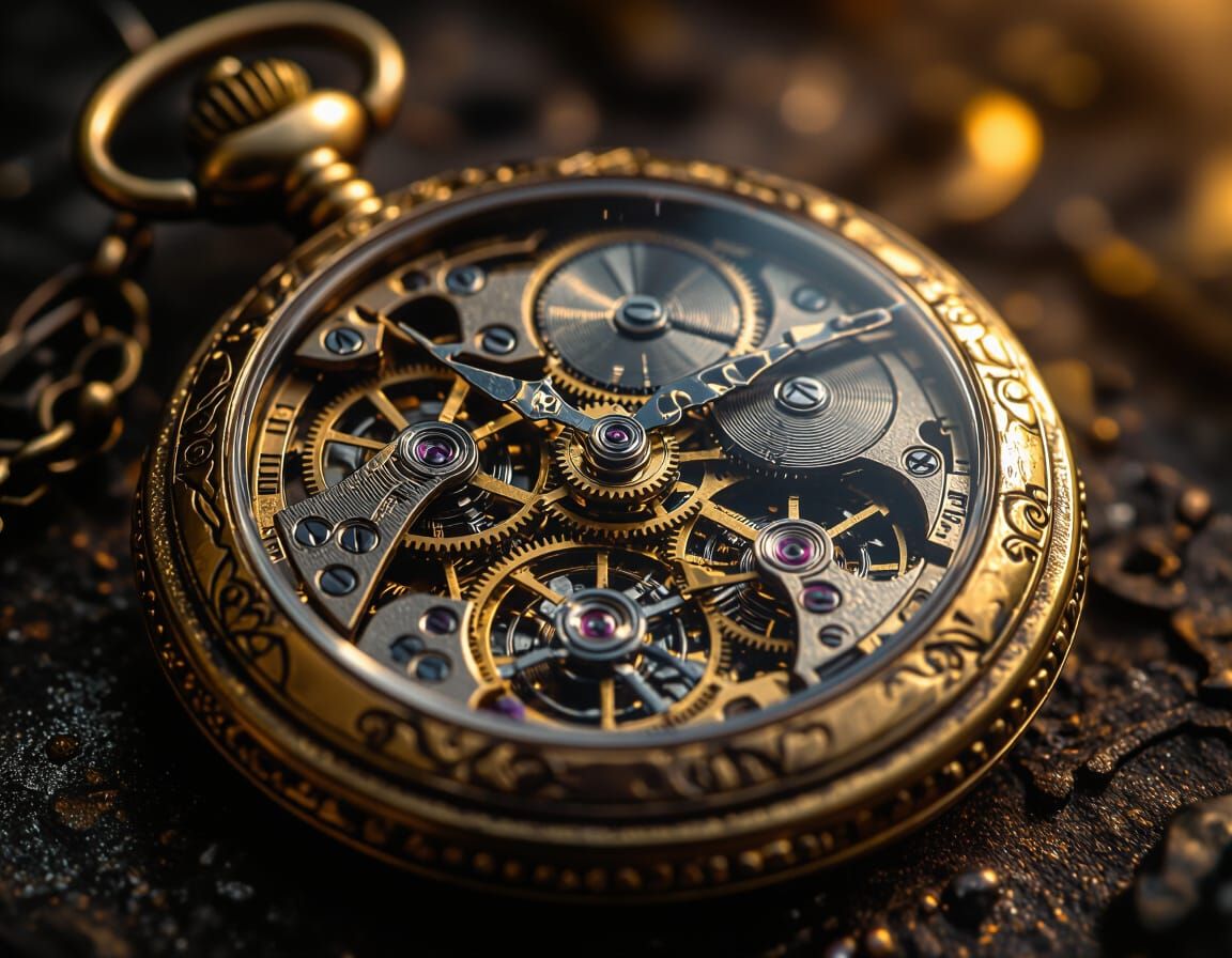 A hyperrealistic, detailed photograph of a broken steampunk pocket watch. Features exposed intricate gears with vintage gold and patina, illuminated by warm, soft cinematic lighting.