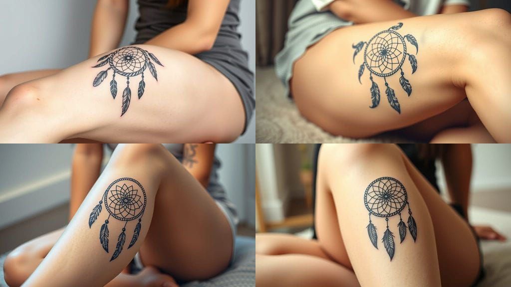 A close-up showcases a dream catcher tattoo on a woman's thigh. The tattoo features a circular hoop with delicate, geometric patterns and detailed feathers in fine line-art.