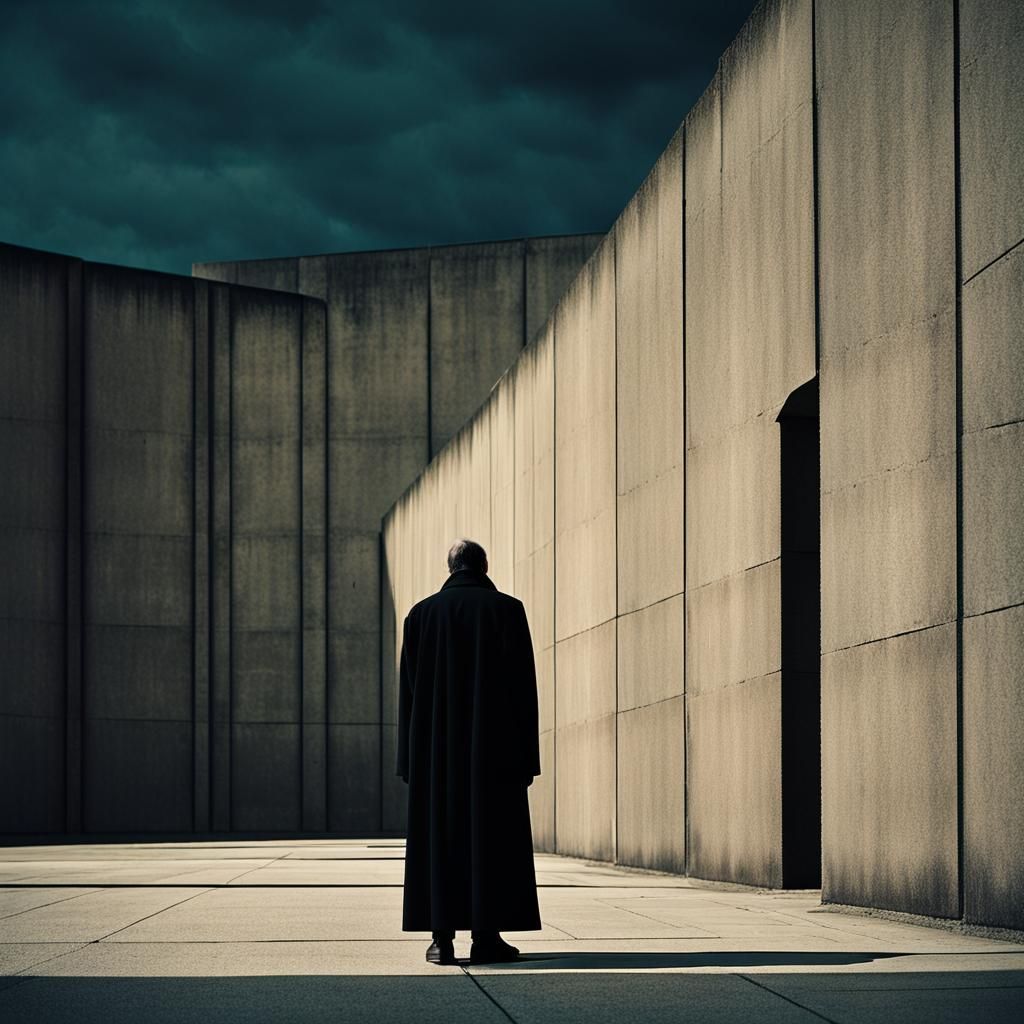 A striking picture of a lone figure standing before a massive, brutalist structure. The cinematic quality art features geometric lines, textures, and an eerie atmosphere in ultramarine and sienna hues.