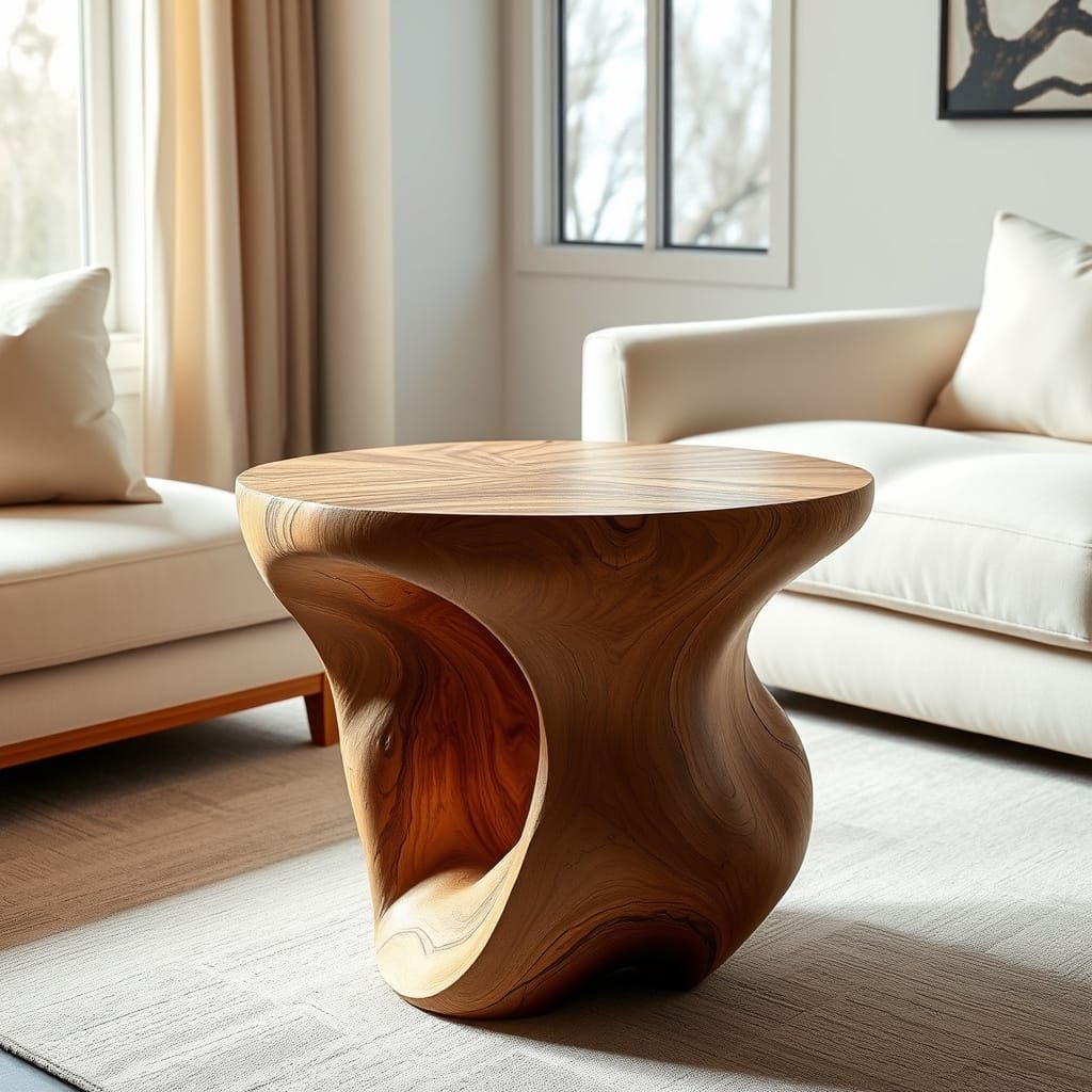 A serene, modern side table features a richly detailed wood grain top with textured edges and organic patterns, reminiscent of Art Nouveau and woodland glades, with a restrained color palette and soft, diffused light.
