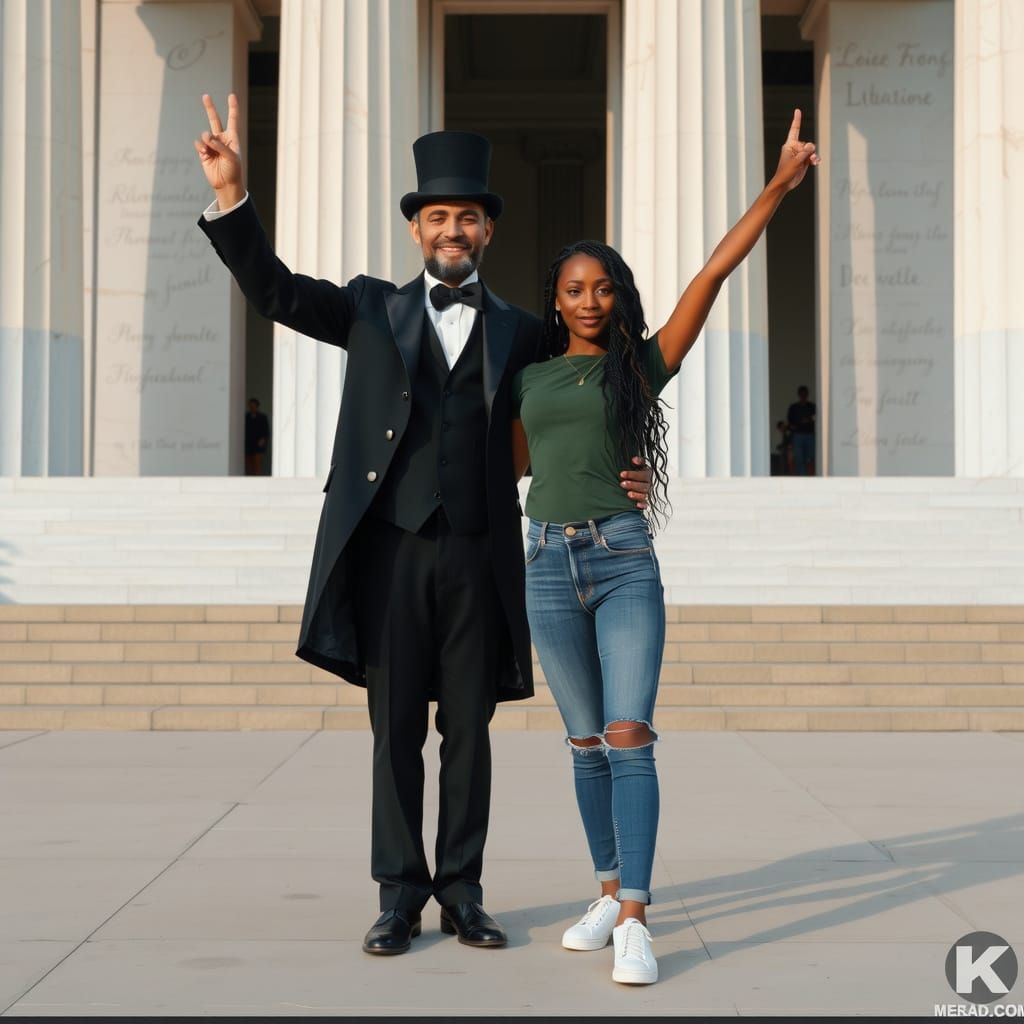 This image shows a dark-skinned African American woman with braided hair and a man in an Abraham Lincoln costume striking a playful pose before a monument.