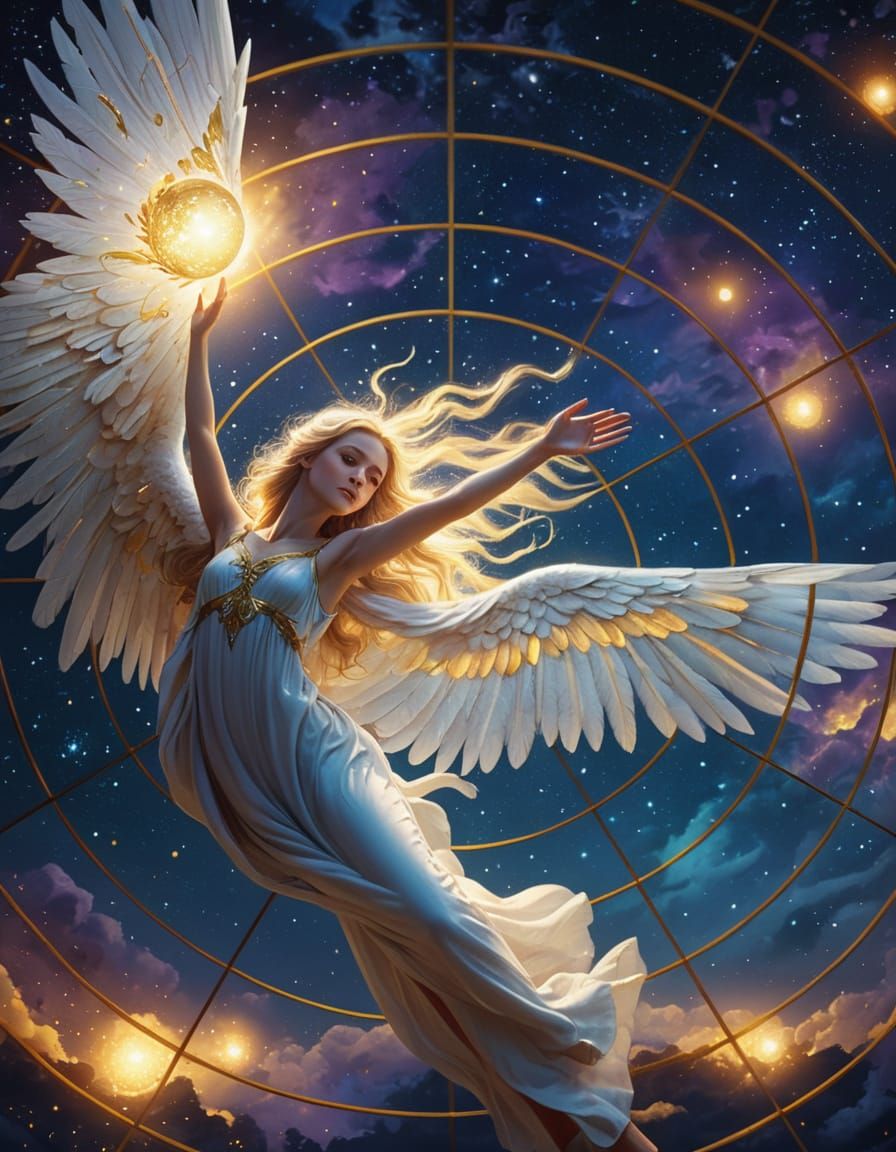 This image shows a beautiful female angel flying through a starry night sky, reaching for a glowing orb with vibrant golden accents, set against a deep blue and purple backdrop with a subtle mist effect, creating a dramatic and cinematic scene.