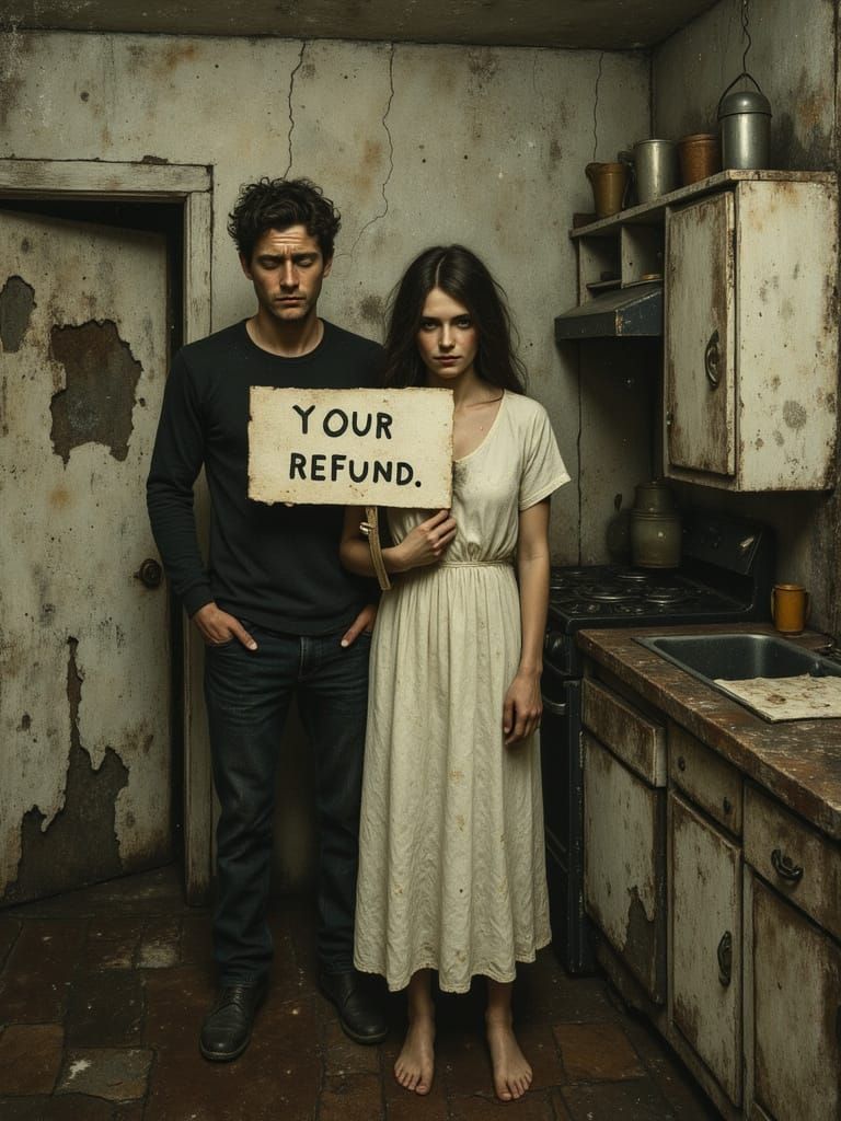 This image shows a poor husband and wife in a dilapidated kitchen, celebrating a tax refund. Rendered in a realistic oil painting style with muted colors and soft lighting.