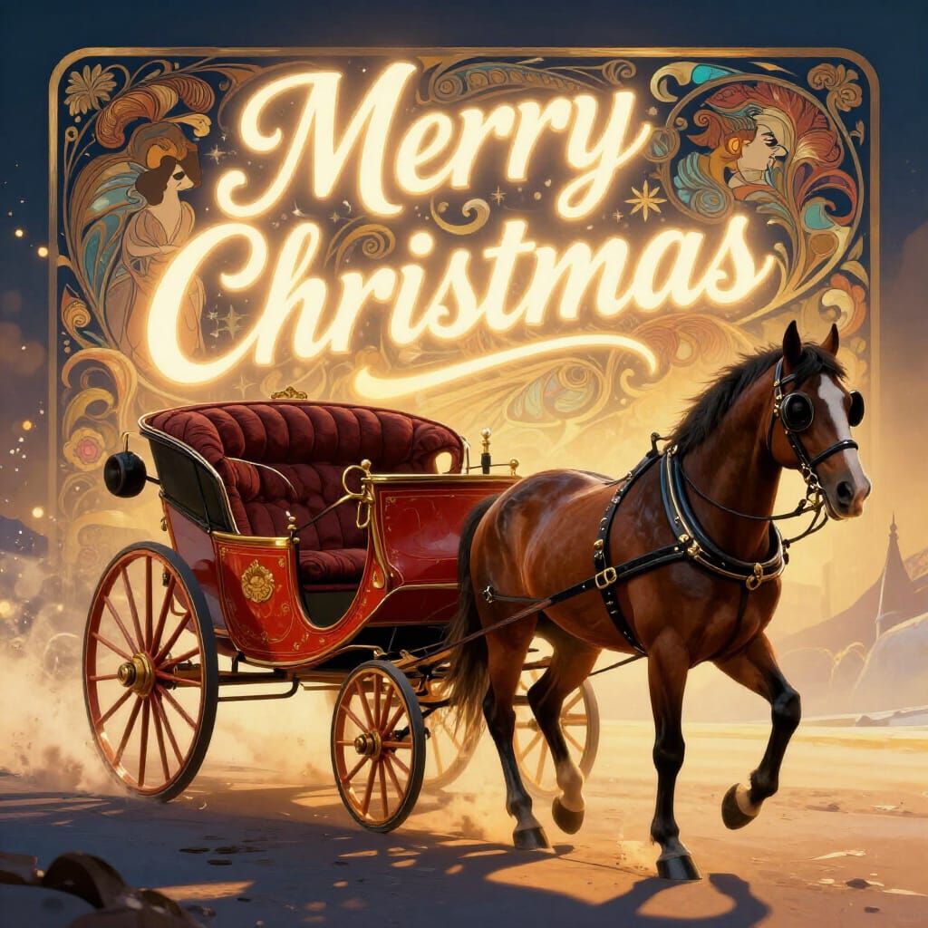 A hyperdetailed portrait of a vintage horse-drawn sleigh ride. Warm golden hour light illuminates the scene and a glowing 'Merry Christmas' script, creating long shadows in this epic fantasy art.